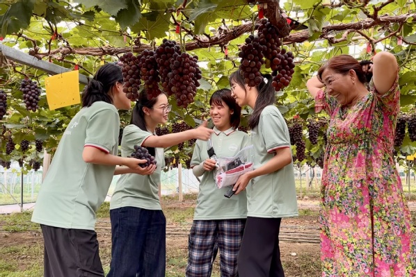 “当年习总书记嘱托我们:现代高效农业是农民致富的好路子,要沿着这个路子走下去。”四季春农业园负责人叶明兰对实践团队说道。现代农业讲求高效,实践团队了解到世业镇每一位像叶明兰一样的农业园主都有一个“小本本”,记录的是农业设施的更新换代或保养维修提醒。叶明兰邀请实践团队进入葡萄园进行实地考察,实践团队观察到,四季春农业园的葡萄大棚内无杂草、葡萄挂果率高、质量好。叶明兰告诉实践团,这得益于智能化、高科技农业设备的引入,让农民能轻易知晓作物冷暖,打破“单纯种、靠天收”的农业高冷印象。在葡萄园中,叶明兰向实践团队分享了自己通过自媒体直播方式打通线上销售渠道的故事,实践团队主动提议,协助农业园完成抖音视频拍摄。