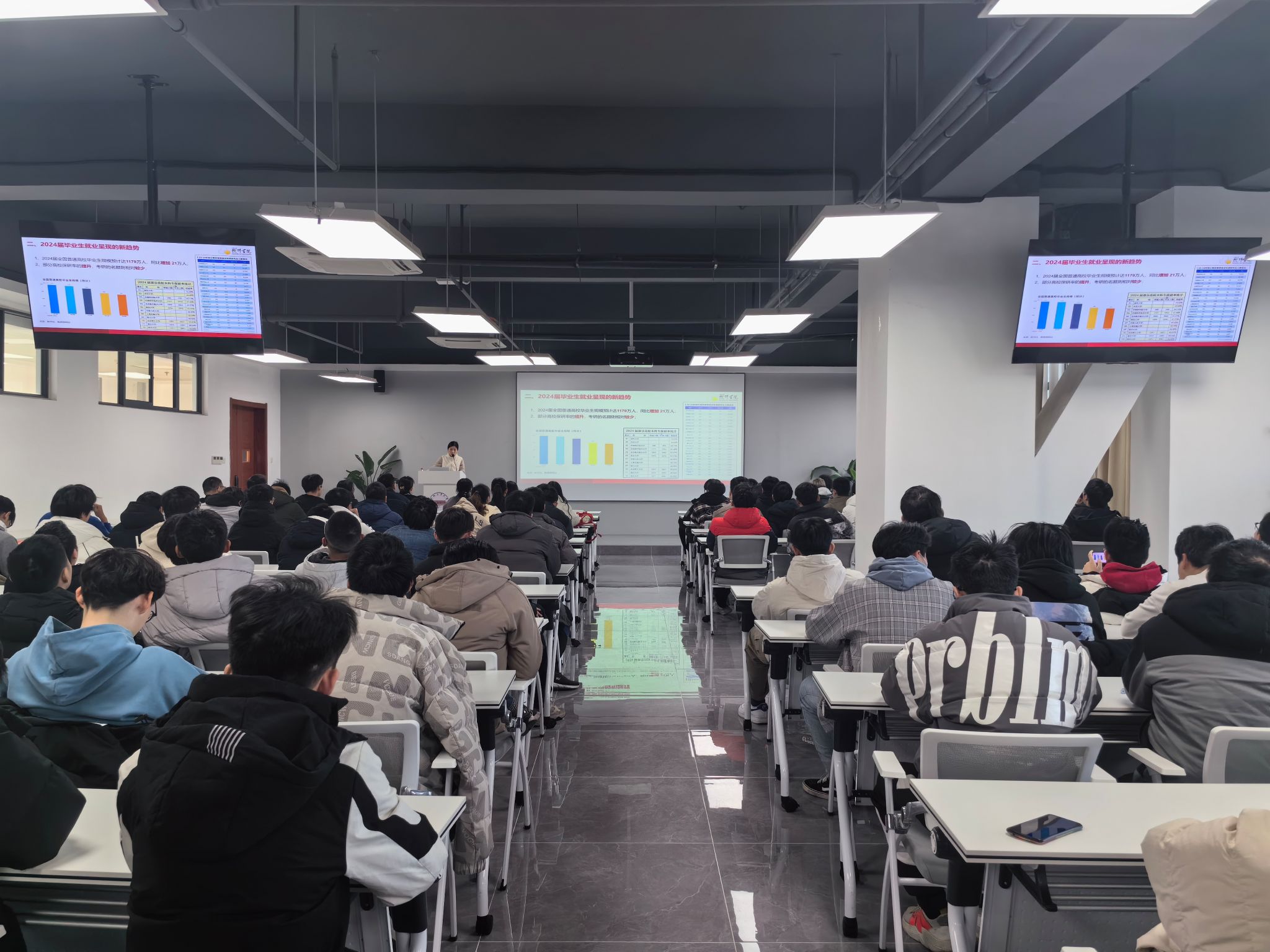 徐本柱讲解了2024届本科毕业生现状,客观分析了就业面临的严峻形势,并提出两个建议:一是积极适应就业形势,把握专业就业趋势的变化,让就业选择和职业生涯规划回归理性;二是明晰个人目标定位,客观分析自身能力水平,平衡好考研、就业的关系,考虑多类型工作,多元化规划职业。